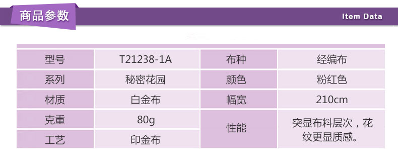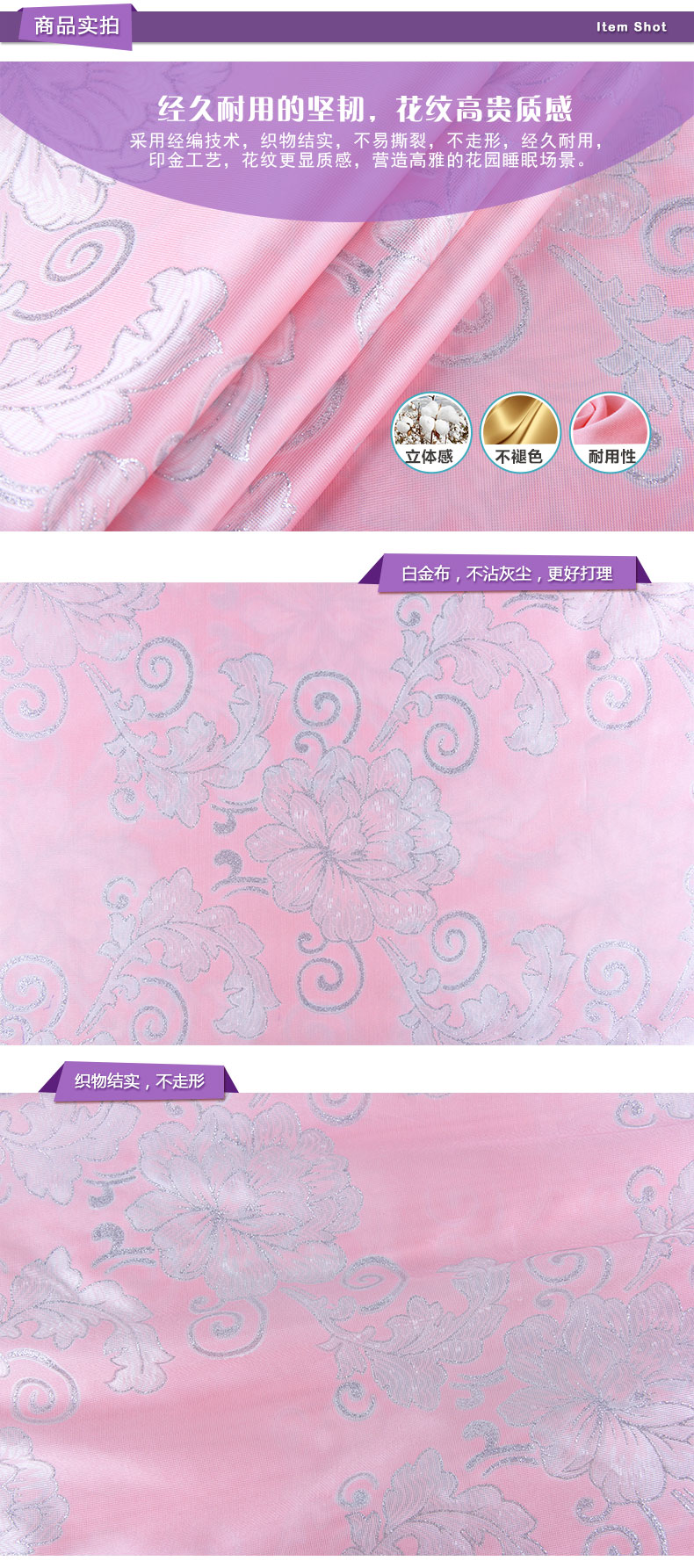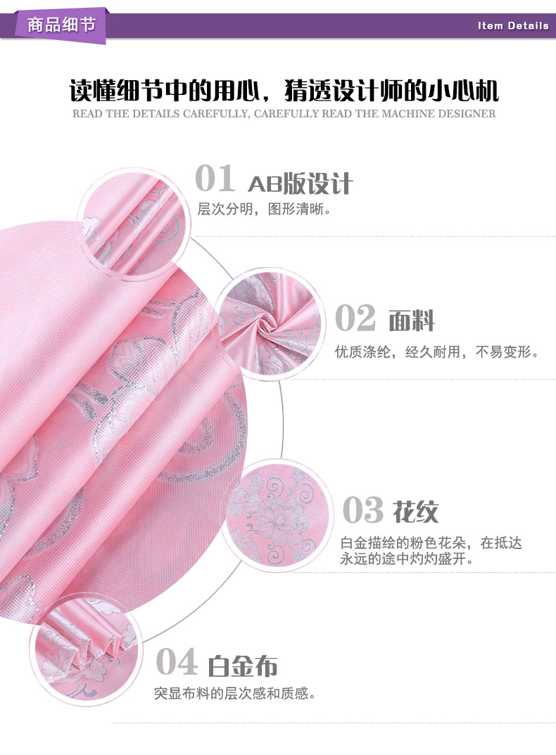 商品描述: 精选白金布,花纹更显高雅质感;粉色是梦幻的颜色,女孩喜欢做梦,生活在自己的小小世界。