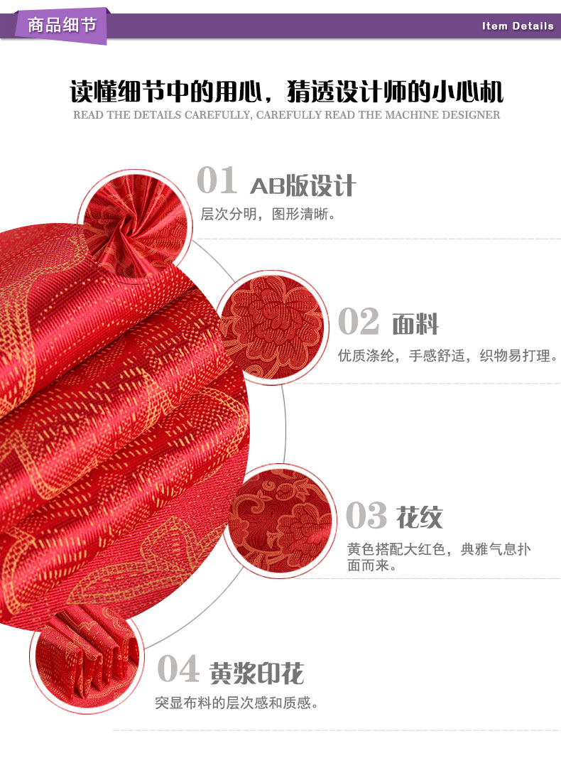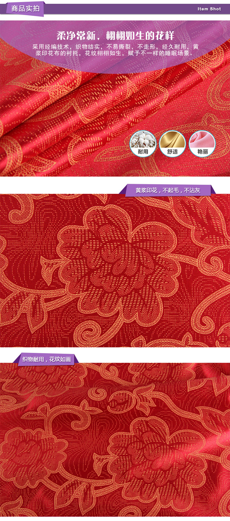 商品描述: 黄浆印花,质感突出,层次分明;金黄的花朵与红色背景相搭配,典雅气息锦上添花