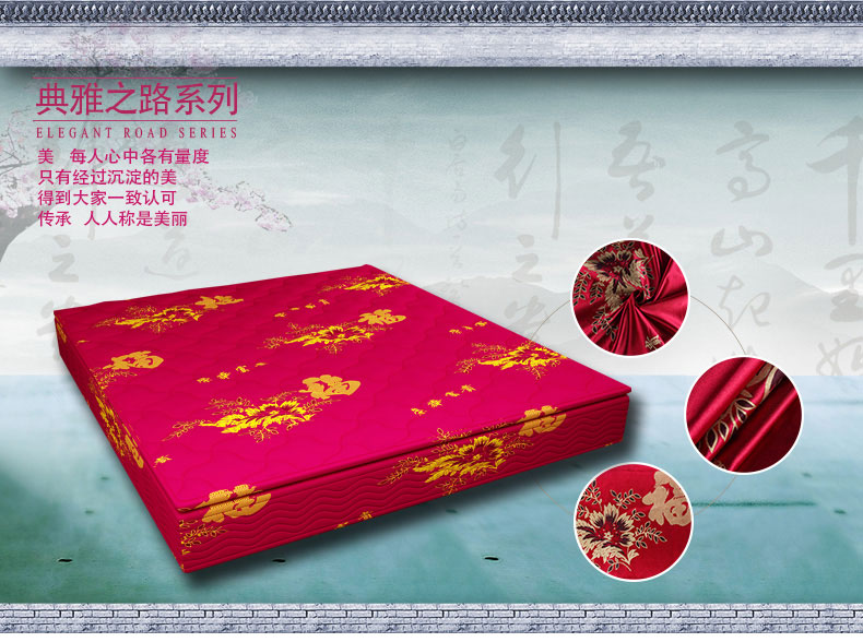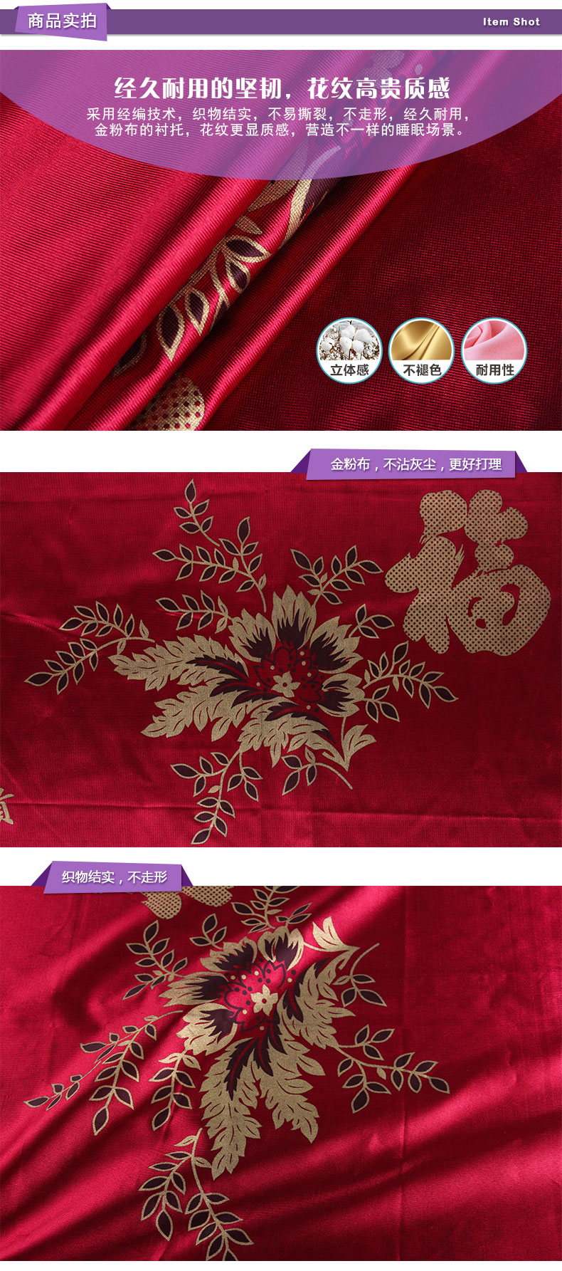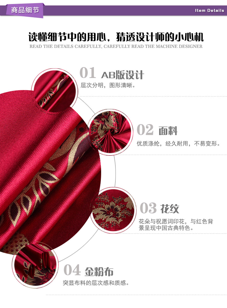 商品描述: 精选金粉布,花纹更显质感;金粉点缀的花与祝愿词,配合红色的背景,尽显中国古典优雅特色