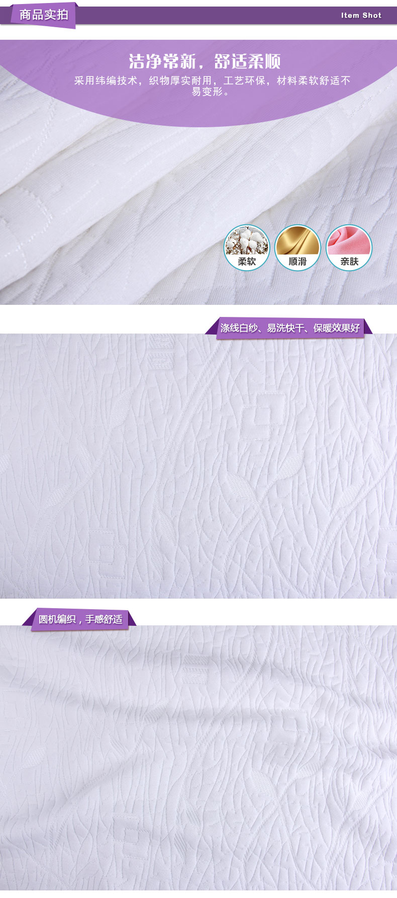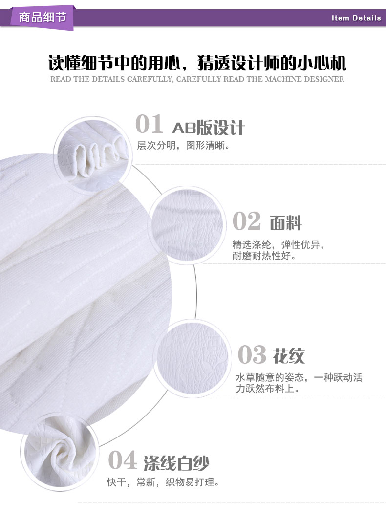 商品描述: 涤线白纱,柔软舒适,洁净易打理;简约中的个性突显,是不愿平凡的表现