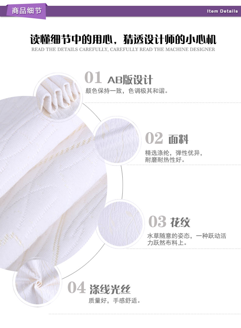 商品描述: 涤线光丝材质,柔软舒适,洁净易打理;简约中的个性突显,是不愿平凡的表现