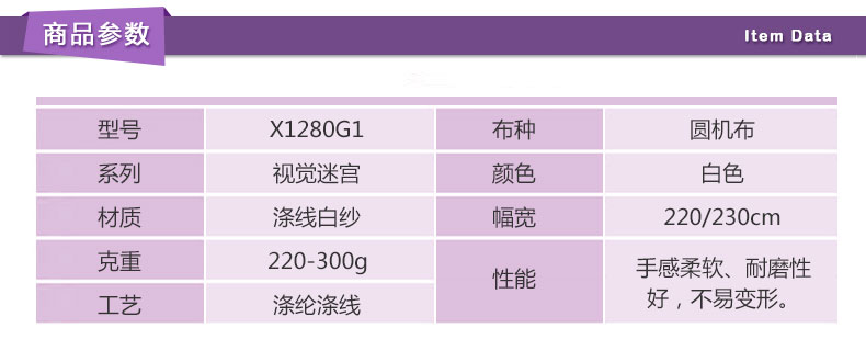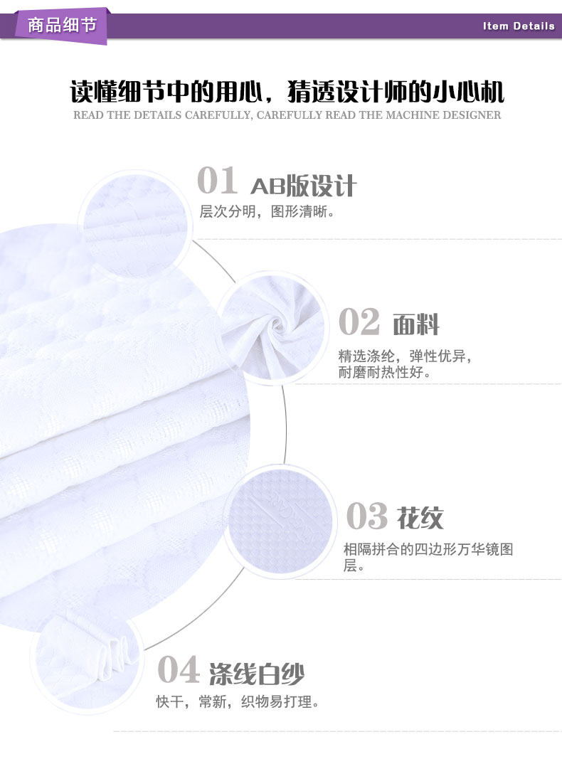 商品描述: 涤线白纱,柔软舒适,洁净易打理;绝对的拒绝之力,钢铁般的意志