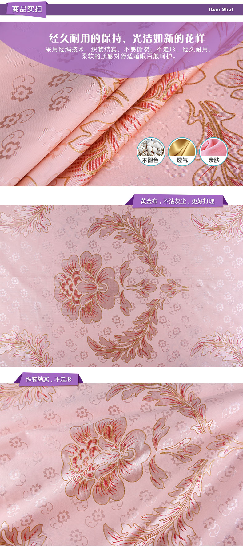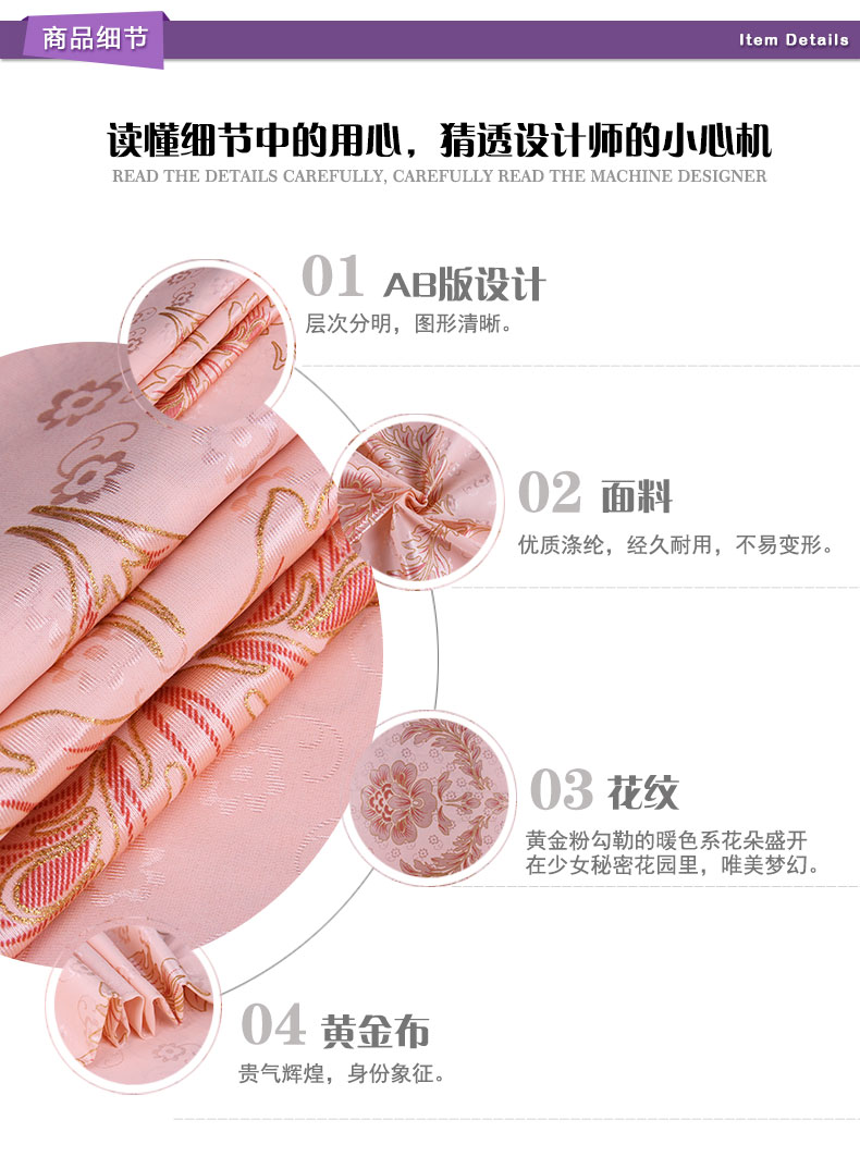 商品描述: 优质黄金布,柔软舒适,印金工艺,贵气质感;甜蜜浪漫的色彩是少女的最爱,愿一直活在温馨简单的世界里。
