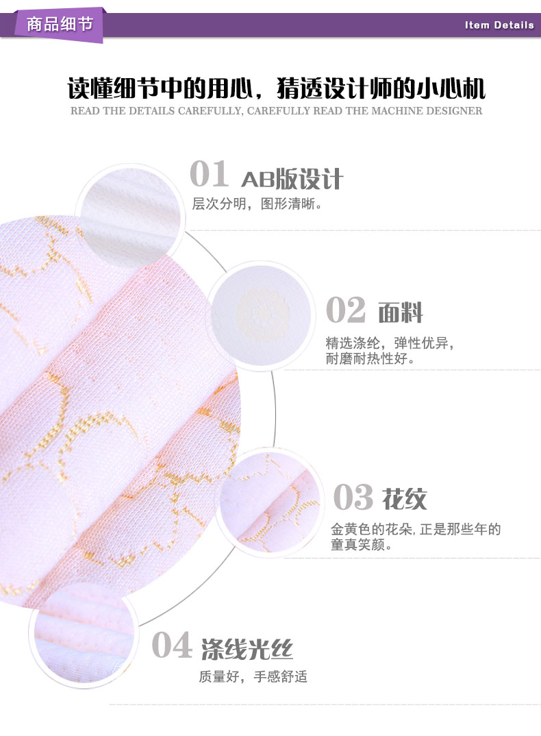 商品描述: 涤线光丝色纱材质,柔软舒适,洁净易打理;那段属于童真的快乐回忆,闪砾着惹人怜爱的小金光