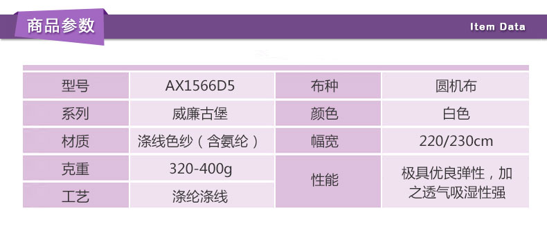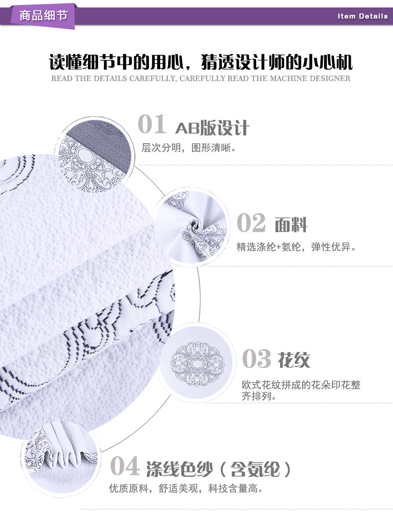 商品描述: 氨纶+涤纶混合,柔软舒适,欧洲风格高贵、典雅又不失浪漫气质。