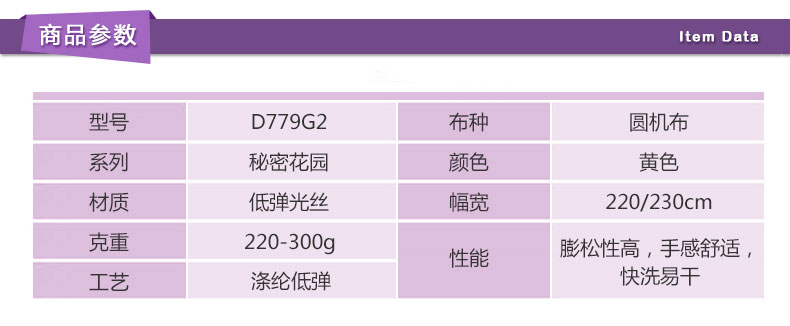 涤纶低弹 > 低弹光丝 > 光丝色纱 > B779-2(旧D779G2)圆机布 涤纶低弹 低弹光丝 黄色