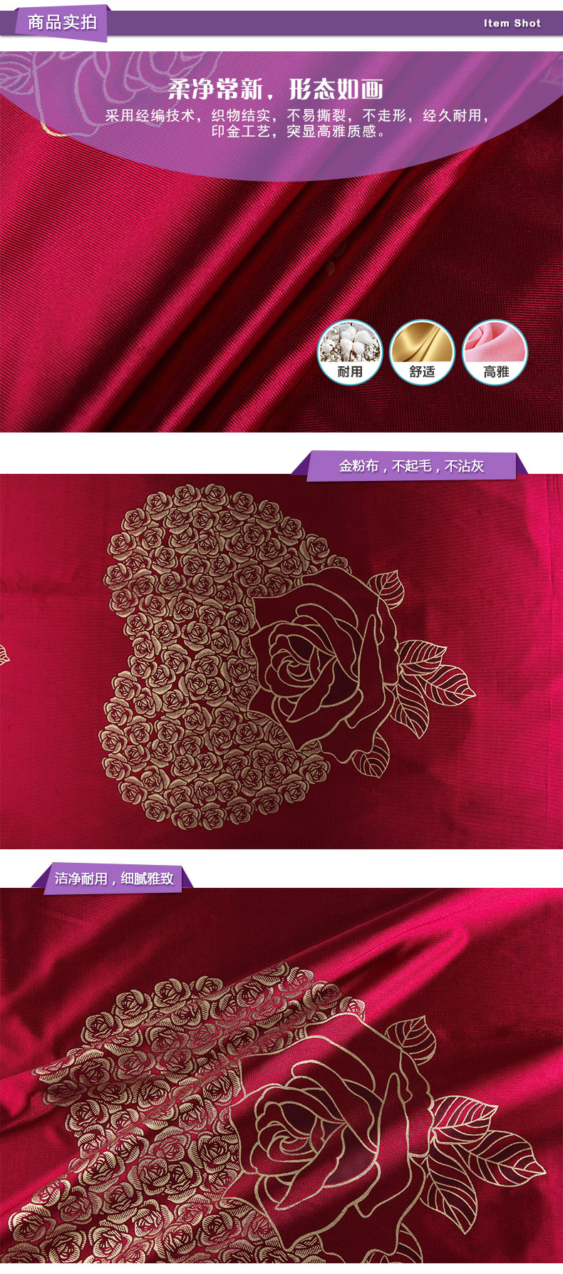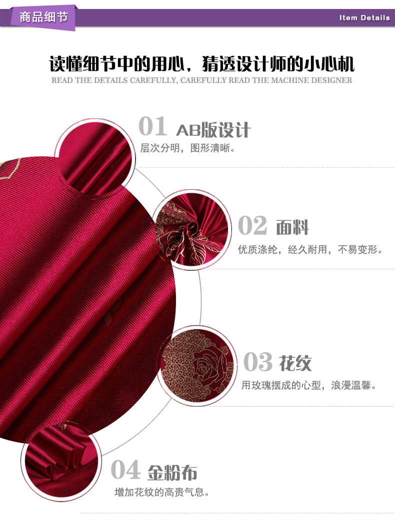 商品描述: 印金工艺,质感突出,层次分明;玫瑰,是每个女人心中炽热的梦。它在女人的梦里悄悄地绽放,甜蜜又浪漫