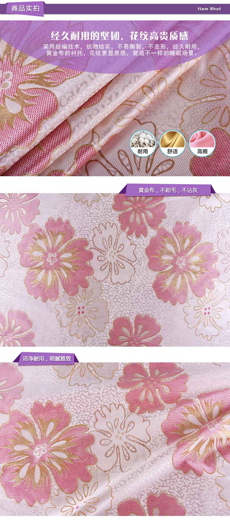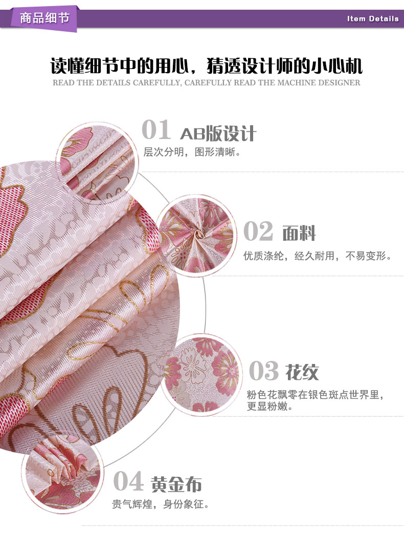 商品描述: 优质黄金布,耐热耐磨,弹性好;粉色花朵散发着蜜一样的馥郁,沁得人熏熏欲醉.