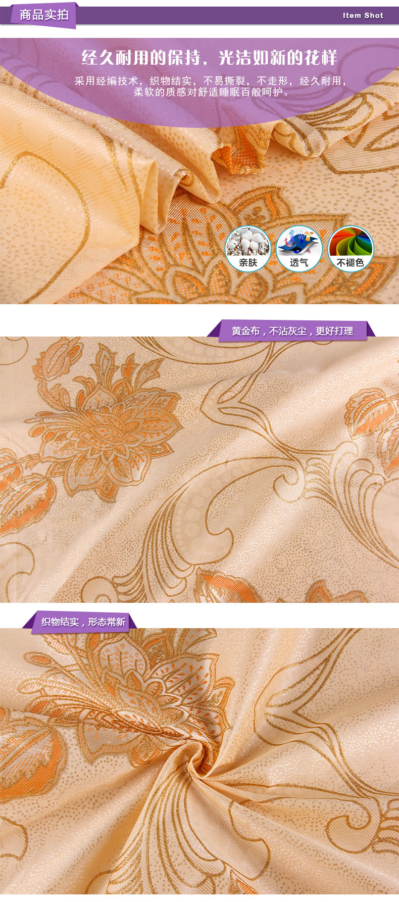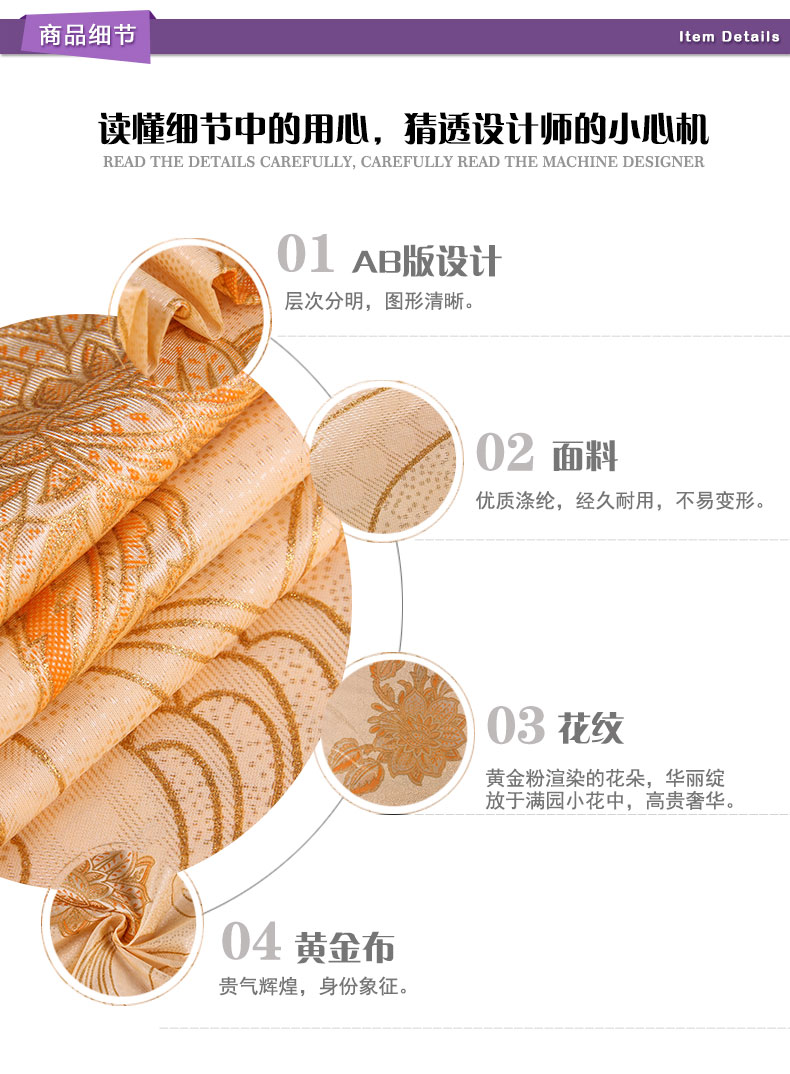 商品描述: 优质黄金布,柔软舒适,洁净易打理;金色花朵加上橙色点缀,富贵逼人
