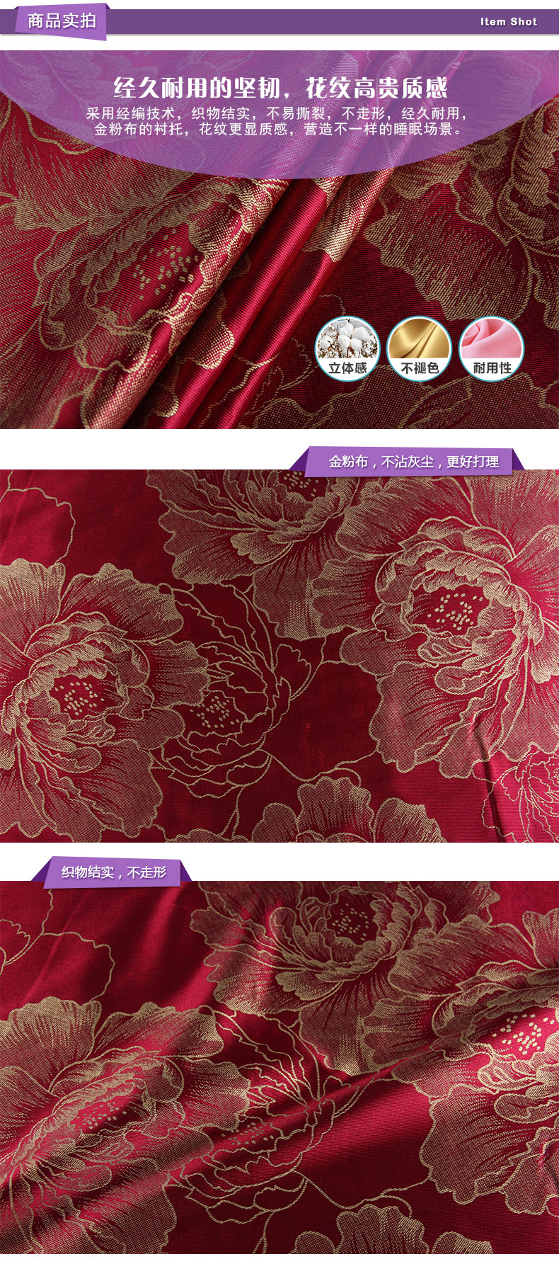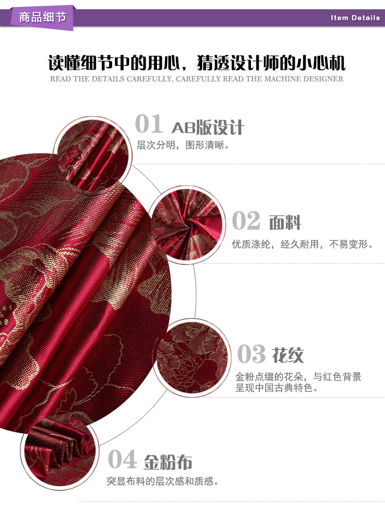 商品描述: 精选金粉布,花纹更显质感;金粉点缀的花朵,配合红色的背景,尽显中国古典优雅特色