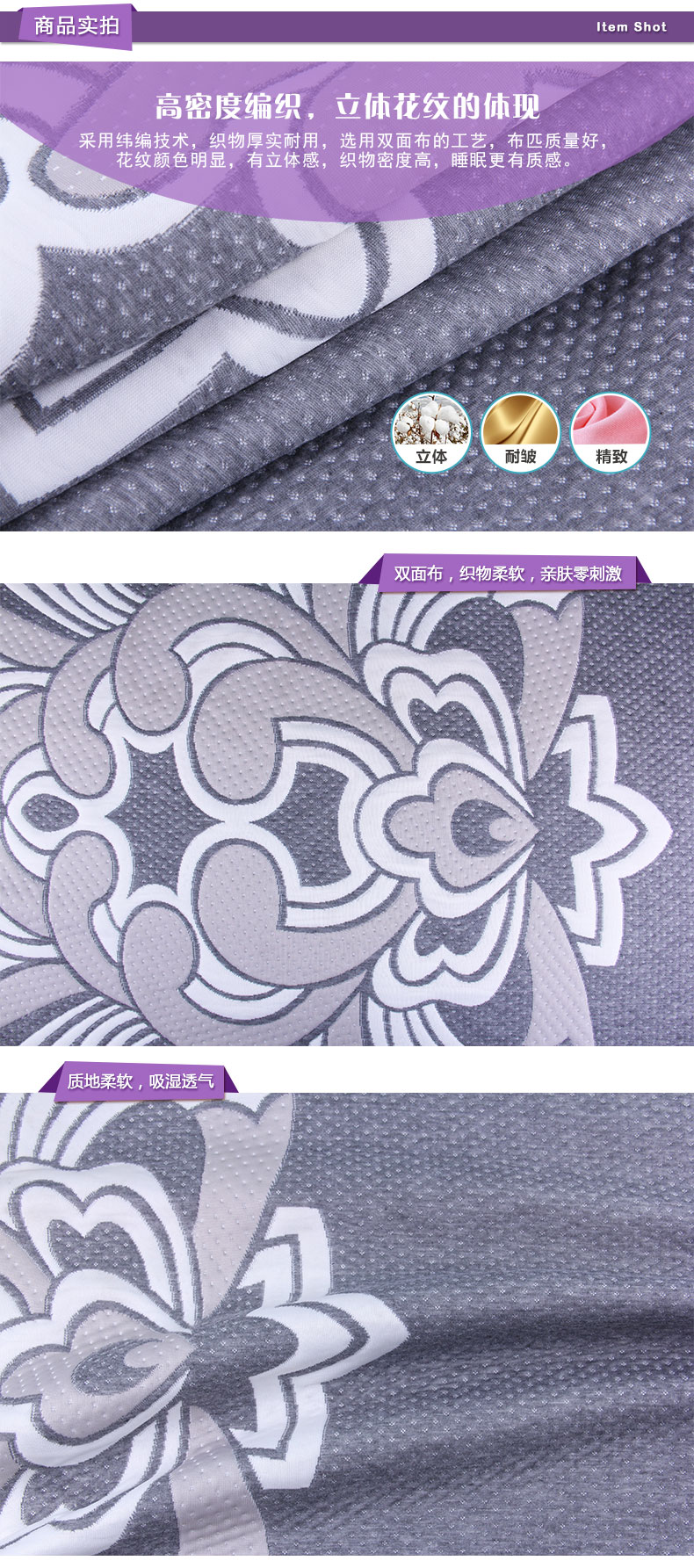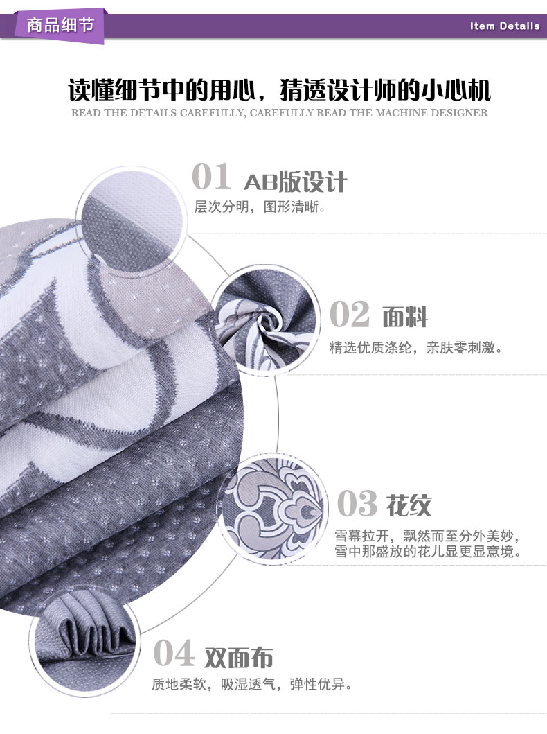 商品描述: 双面布花纹颜色明显、立体感强;雪花纷然落下,飘飘落落洒满心间,一朵娇花傲立雪中。