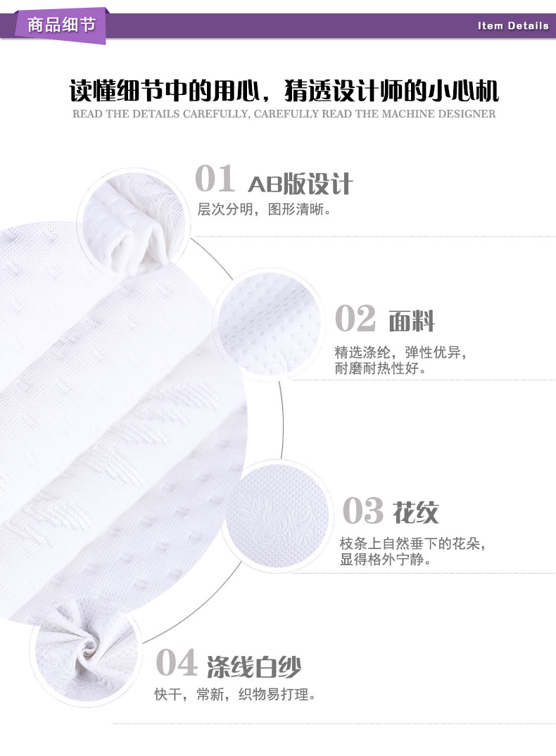 商品描述: 涤线白纱,柔软舒适,洁净易打理;独自的世界不代表寂寞,享有属于一个人的宁静