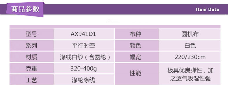 涤纶涤线 > 涤线白纱 > 含氨纶 > E941-2(旧AX941D1)圆机布 涤纶涤线 涤线白纱(含氨纶) 白色