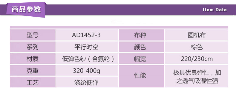 涤纶低弹 > 低弹色纱 > 含氨纶 > E1452-3(旧AD1452-3)圆机布 涤纶低弹 低弹色纱(含氨纶) 棕色